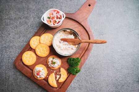 Top view of tasty tuna spread with crackers on wooden tray and black stone background with copy space, healthy food and appetize concept