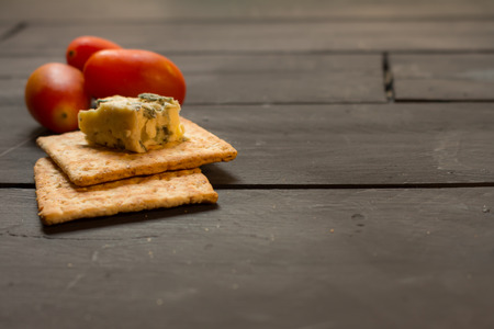 Tomatoes, cookies and blue cheese on a black wooden rustic board. Food for an Italian appetizer. Dark food