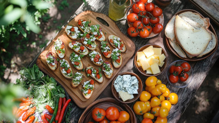 A colorful spread of fresh foods on a rustic wooden table, featuring tomatoes, cheese, and herbs, perfect for a summer gathering or outdoor picnic.