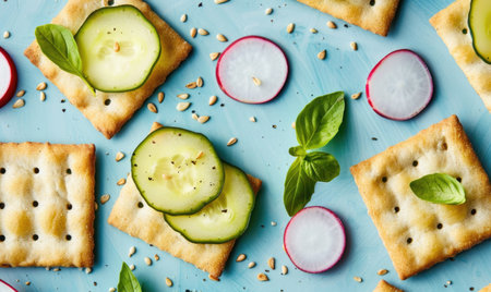 Avocado and radish slices on whole grain crackers on a light blue background