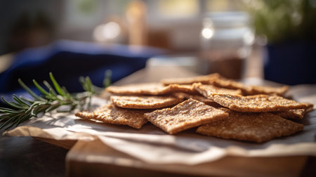 AI Generated. Crispy Handmade Crackers Stacked on Wooden Board Freshly Baked and Delicious for Snacking or Serving