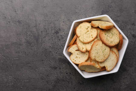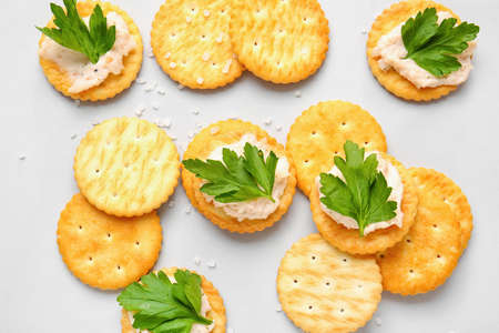 Tasty crackers on gray background