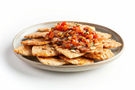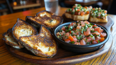 A vibrant platter featuring toasted bread slices and fresh bruschetta. Perfect for appetizers or sharing, this colorful dish showcases seasonal ingredients and gourmet flavors.