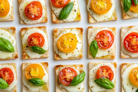 Colorful pita bread squares with melted mozzarella and fresh tomatoes on a white background