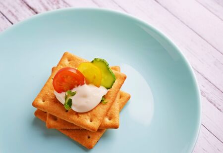 Delicious crackers with cheese sauce and vegetables.Snack on wooden background.