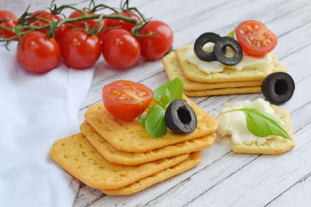 Crunchy crackers with cream cheese, tomatoes and olives.