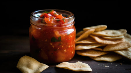 A Jar Of Homemade Salsa With Tortilla Chips