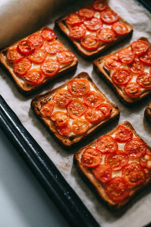 Baked sandwich with cheese and cherry tomatoes on dark bread. High quality photo
