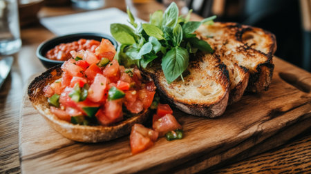 A plate of Italian bruschetta with tomatoes, basil, and olive oil, served on a rustic wooden board. The table is empty with no diners present