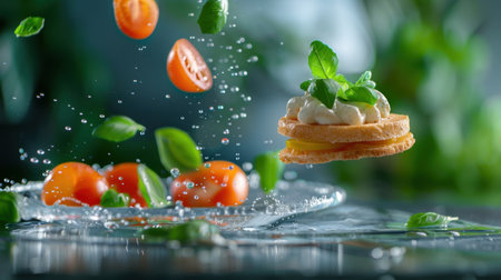 A stunning arrangement showcasing fresh basil sprigs with whipped cream and cherry tomatoes in mid-air, creating an inviting and vibrant culinary scene filled with drops of water.
