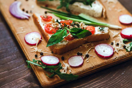 bruschetta with tomato basil and rucola on wooden board