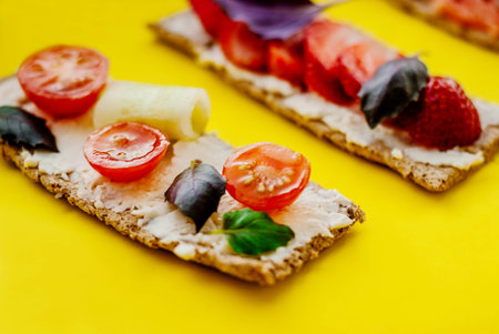 Healthy snack with crispbread, cream cheese, strawberry, grapefruit, tomato and cucumber on a yellow background. Healthy food concept. Flat lay, top view, square