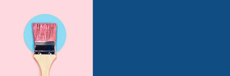 Renovation picture. Pink background with one pain brush located on blue circle, central composition. Flat lay, top view, copy space.