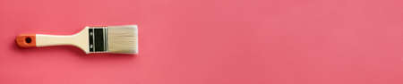 Flat lay on paper, paint brush on coral background, panoramic image with space for your text