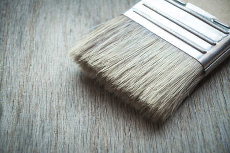 Paint brush on wooden table close up shot