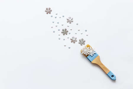 Isolated Big brush with blue paint and snowflake figures on a white background