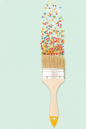 Colorful confetti splashing from paintbrush on blue background. Party, celebration, Christmas concept.