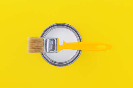 yellow brush on an open can with white paint on a yellow background close-up top view