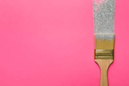Brush painting with silver glitter on pink background, top view. Space for text. creative concept