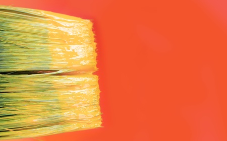 Tip of a paint brush with yellow paint and a orange canvas with copy space in the background