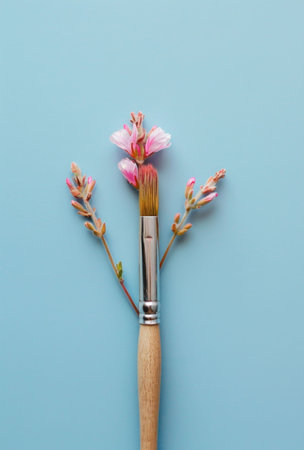 A paintbrush with pink flowers on a light blue background showcasing creativity and nature s beauty