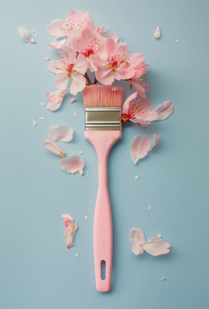 A soft pink paintbrush adorned with delicate cherry blossom petals on a pale blue background