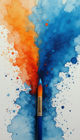 An abstract watercolor painting with vibrant blue and orange splashes blending together, representing creativity and artistic expression. The textured background adds depth to the colors.