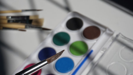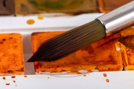 Set of watercolor paints and synthetic brushes for painting. Drawing process.