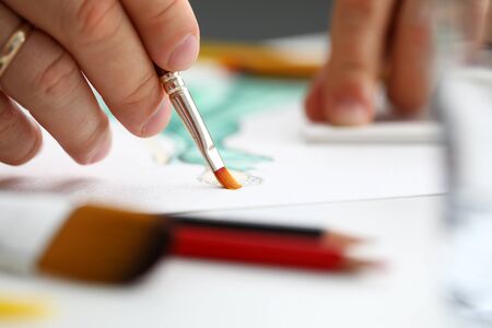 Close up of the detail of the hands of an unrecognizable artist while he is painting with watercolors on a canvas. Art concept. Selective focus. Space for text.