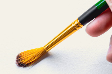 Close-up of a paintbrush with orange bristles placed on a textured white surface. Generated A.I.