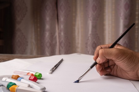 Hand holding brush painting, paint tools, bottles of water color, drawing on white paper or drawing paper, artistic, creative creator, designing and education concept. Close up selective focus.