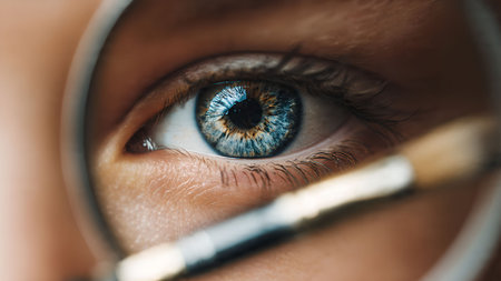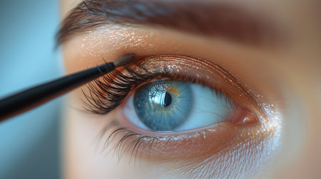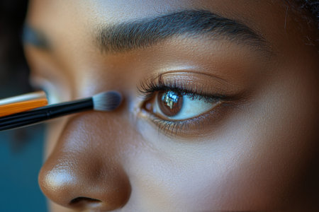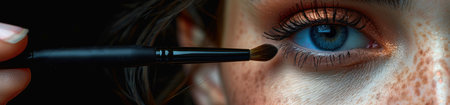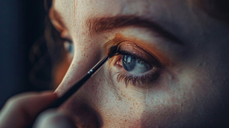 A close up of a womans eye with makeup brush, AI