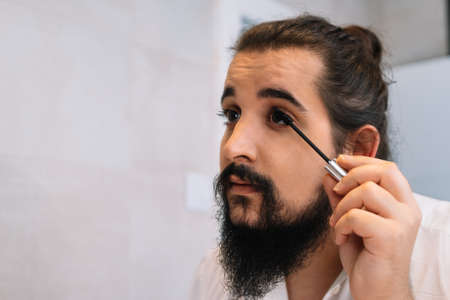 Young man making up his eyelashes in the bathroom. Using eyelash mask.