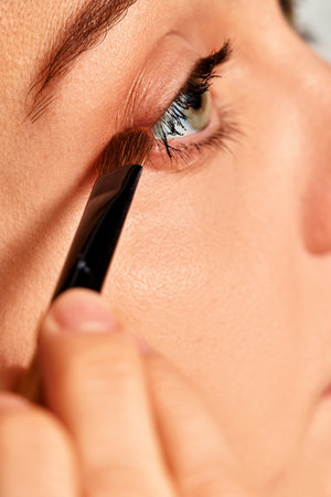 Woman applying cosmetic product with makeup brush on eyelid for beauty