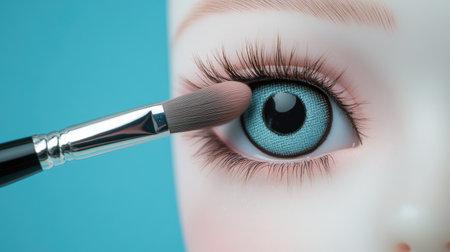 A captivating close-up showcases a makeup brush gently applying eyeshadow on a doll's striking blue eye, emphasizing detail and artistry in cosmetics.
