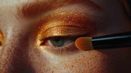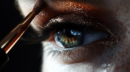 This close-up image features an eye adorned with sparkling gold glitter makeup, highlighting artistry and beauty trends, complemented by a makeup brush in motion.