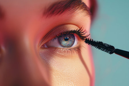 Close-up of a young woman intently applying mascara to her eyelashes
