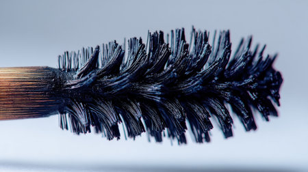 Close up view of mascara brush showcasing its unique bristle design and dark product residue. intricate details highlight tool functionality for enhancing eyelashes