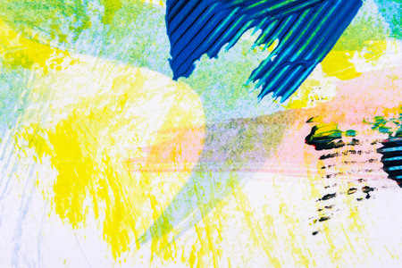 Macro shot of abstract acrylic art background. Multicolor light and bright texture. Fragment of artwork. Spots of acrylic paint. Modern contemporary art.
