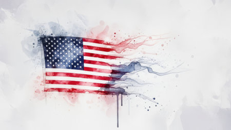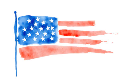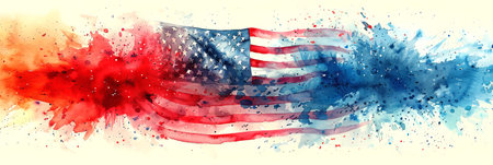 Fluid American flag in watercolor medium. Red, white, and blue merging organically. Concept of patriotism, American independence, and the art of national symbolism. Banner with copy space