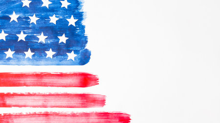 Composition of painted american flag stars and stripes pattern on white background. united states of america patriotism and independence concept digitally generated image.