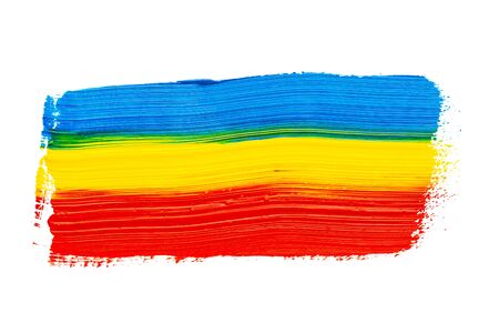 Abstract multicolored real oil painting brush strokes isolated on white background, painted with blue, yellow and red oil color by hand.