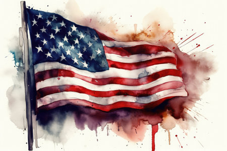 Watercolor Flag of America with Paint Splash on White Background. 4th of July Independence Day of the USA Illustration for Banner, Poster, Invitation, Greeting Card or Cover. Ai Generated.