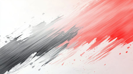 A clean white canvas showcases bold strokes of vibrant crimson and sleek gray, blending and contrasting to produce a dynamic abstract artwork in a well-lit studio environment.