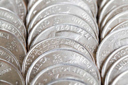 a stack of American twenty-five-cent coins, a close-up of American coins