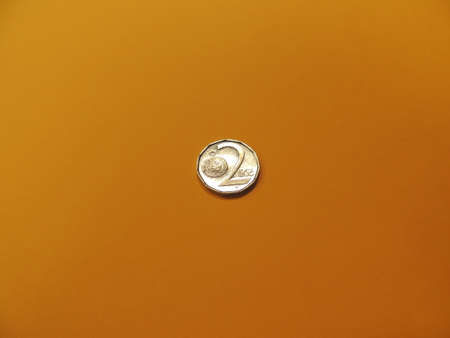 An iron coin with a face value of 2 Czech crowns on a yellow background. Macro. Czech Crown. Silver.