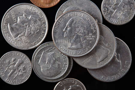Various American money, Washington quarter dollar or 25-cent silver coin. Assorted Usa Coins. Money, Financial, Business Growth concept. Finance background.