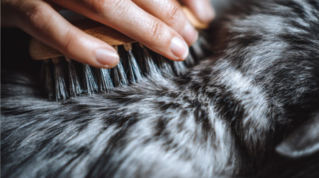 A person brushes the fur of their pet, showing care and trust in the moment. The light tones enhance the connection they share.