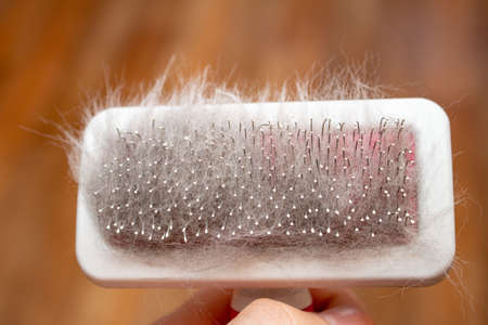 Pet brush with gray fur after grooming pet cat allergy fur concept close up
