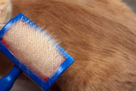 Red cat hair. Cat hair brush with red cat hair on it. Pet care concept. Allergy to animal hair concept.